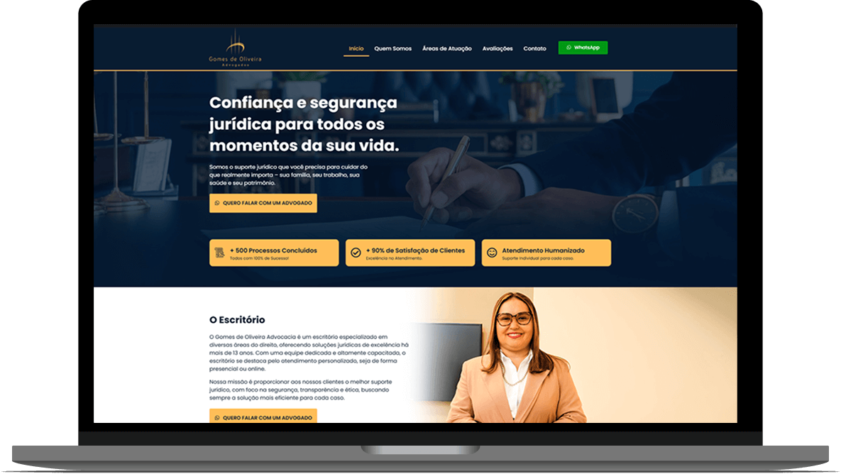 Desenvolvemos Websites Institucionais e Landing Pages Estratégicas para advogados, combinando design profissional, performance e conversão.